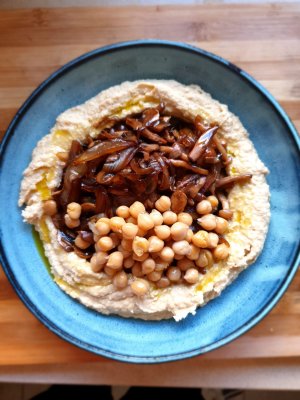 חומוס בייתי קל ומהיר עם פטריות מרפא מוקפצות, חלבון בריא וזמין מהצומח
